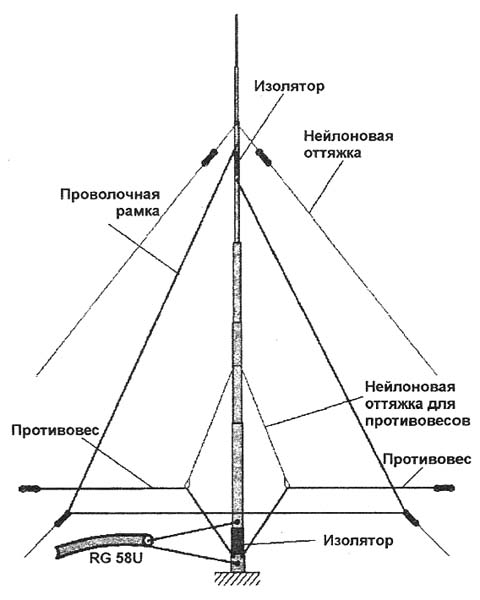 Рамка должна быть отведена в сторону от вертикального излучателя. Кроме того, она служит двумя оттяжками верхней части излучателя. Длина коаксиального кабеля RG-58U — не менее 26,5 м.